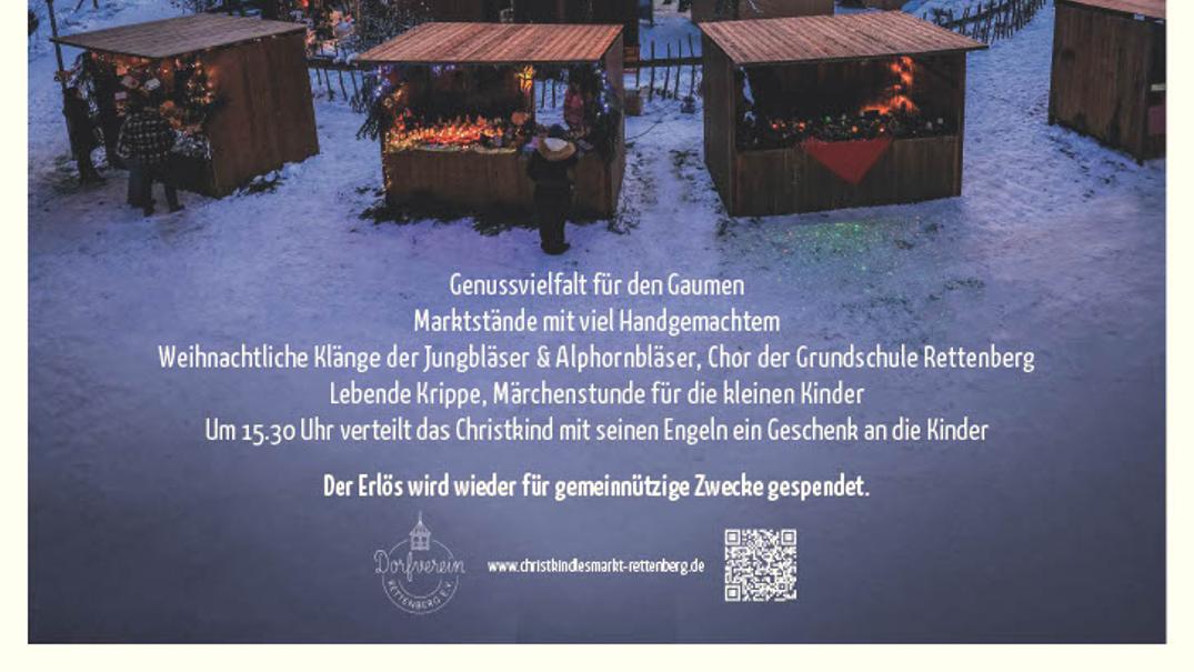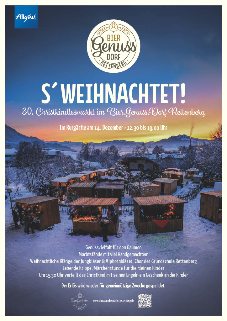 Am 14. Dezember 2025 findet von 12.30 bis 19.00 Uhr der 30. Christkindlesmarkt im Bier.Genuss.Dorf Rettenberg statt. Die Veranstaltung findet im Kurgärtle beim Rathaus statt.